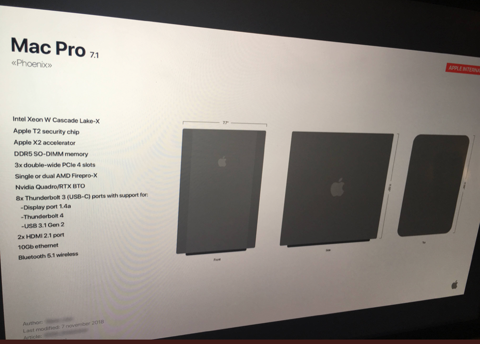 Jetzt sind einige Screenshots (Quelle) einer angeblichen Produktzeitung aufgetaucht, die von Apple stammen soll. Darin wird ein modularer Mac Pro, dessen Design sowie die Spezifikationen, beschrieben. Der MacPro7,1 soll auf den Codenamen Phoenix hören. Laut Apple Nomenklatur würde ein Nachfolger des aktuellen MacPro6,1 (Trash Can) also MacPro7,1 lauten, so weit - so richtig. Wir glauben dennoch an einen Fake. Zu glatt ist alles, was hier aufgezeigt wird.