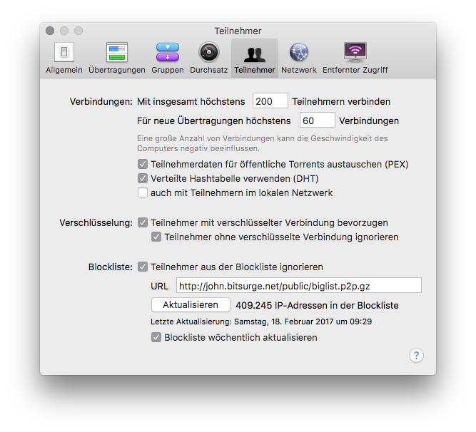 Der beste Bittorrent-Client für OS X ist bekanntermaßen der legendäre Transmission, der in seiner Inkarnation auch auf Arm läuft und sein Dasein in Routern fristet etc. pp., egal. Auch Transmission unterstützt die Möglichkeit, eine Blockliste zu laden. Dort werden kritische IPs gespeichert, die der Client dann beim Download ignoriert. Das ist aus unterschiedlichen Gründen gut.