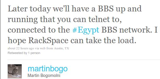 Haha, wie geil ist das denn? Fidonet und BBS sind wieder da! Längst tot geglaubte Techniken des letzten Jahrtausends. In Ägypten. Und warum fragt ihr euch? Weil da gerade alles hinfort-zensiert oder das Internet ganz abgeschaltet wird und über diese alten Techniken zumindest Informationsaustausch weiterhin funktioniert, wie früher eben. Ach, was waren das für Zeiten...