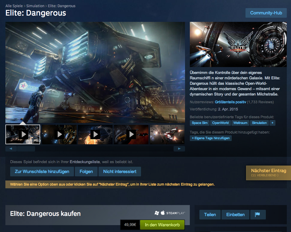Und nun kommen wir zum eigentlichen Kern der Meldung, ihr mögt die lange Hinführung verzeihen, denn Elite Dangerous, der auf Kickstarter gefundete Nachfolger des legendären 80er-Jahre-Weltraum-Handel-Spiels ELITE ist seit gestern in einer Version für den Mac erschienen. Yolo!