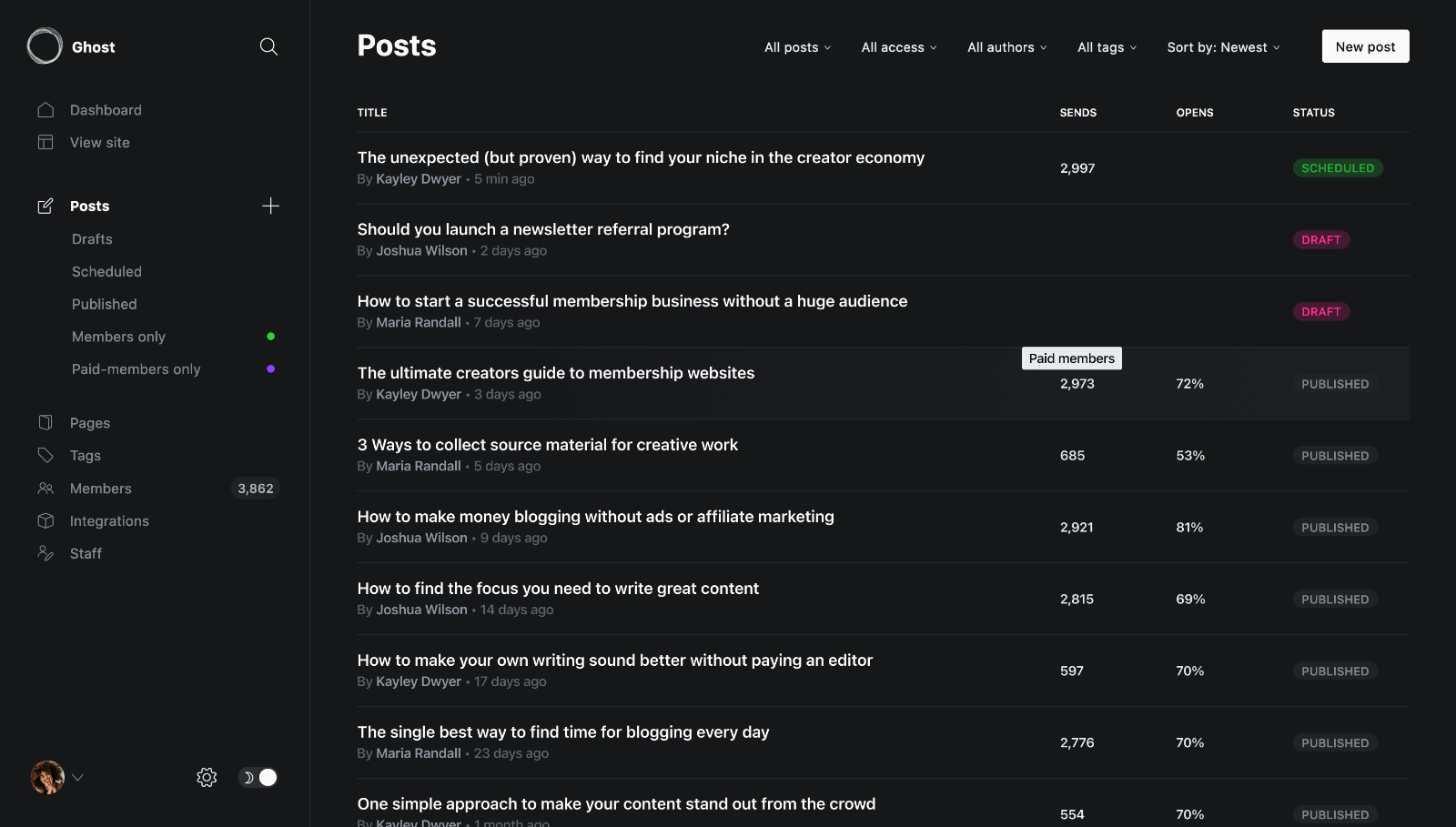 Dass was ich eigentlich mit jedem Webtracker machen kann, wird in Ghost integriert. Ich kann also genau sehen welche Artikel von wem gelesen werden und welche Inhalte weniger populär sind. Das ganze natürlich in Verbindung mit den erwähnten Subscriptions und Memberships.