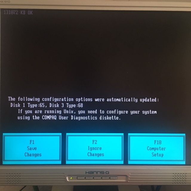 Allerdings stellt Compaq für diesen Fall zwei Disketten zur Verfügung, mit deren Hilfe man die Partition wieder erstellen und die grafische BIOS-Oberfläche wieder installieren kann. Diese Disketten funkgieren praktischerweise als Boot-Disk und bieten auch die BIOS Oberfläche von Diskette an, ganz ohne Installation. So kann man von diesen Disketten booten und folglich doch noch Einstellungen vornehmen, auch wenn die Partition aus irgend einem Grund gelöscht worden sind.