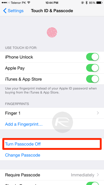 - Schaltet den Passcode und TouchID in den Einstellungen unter „TouchID & Code“ aus.