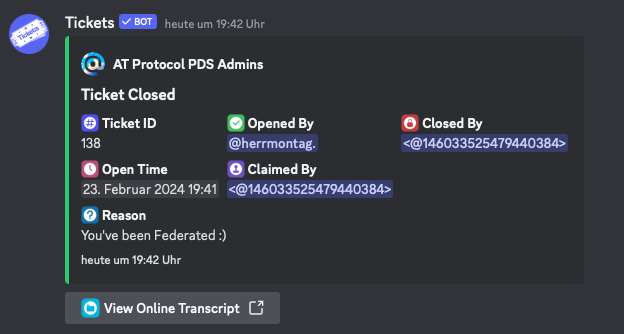 - Meldet euch also beim Discord-Server an und eröffnet bei BSKY ein Ticket, dort tragt ihr eure Domain ein. Dadurch meldet ihr, dass ihr eine eigene Instanz betreiben wollt und dürft föderieren.