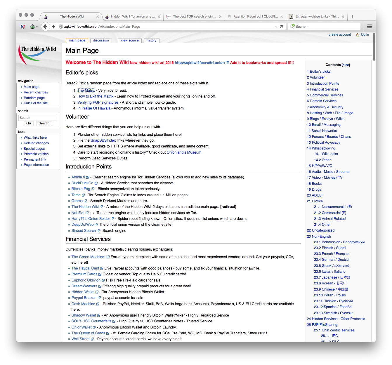 Diese Liste umfasst neben Links zu Blogs, Marketplaces, politischen Services, Erotik, Bitcoin-Zeugs, Finanzwebsites oder auch Foren Zugang zu deutschen Tor-Service-Websites oder zur legendären Silk Road, mit dem TOR stieg und fiel, sozusagen.
