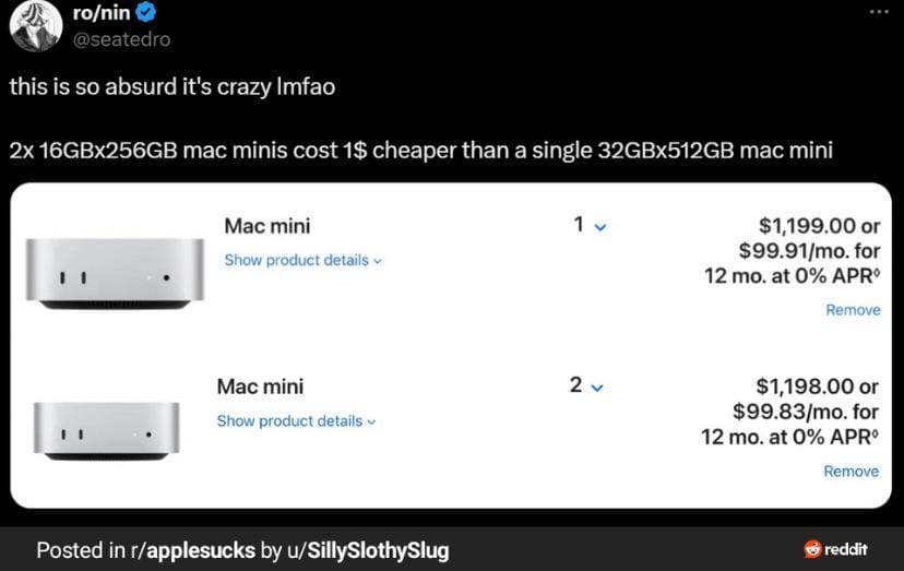 Tolle Neuigkeiten für alle, die sich an Apples Upgrade Politik, also vielmehr deren Preisen, stören. Denn erst neulich gab es dieses Meme was sehr zu Lachern führte, weil zwei Mac Mini mit 16 GB RAM und 256 GB SSD genau so teuer sind, wie das Upgrade eines Mac Minis auf 32 GB und 512 GB SSD.