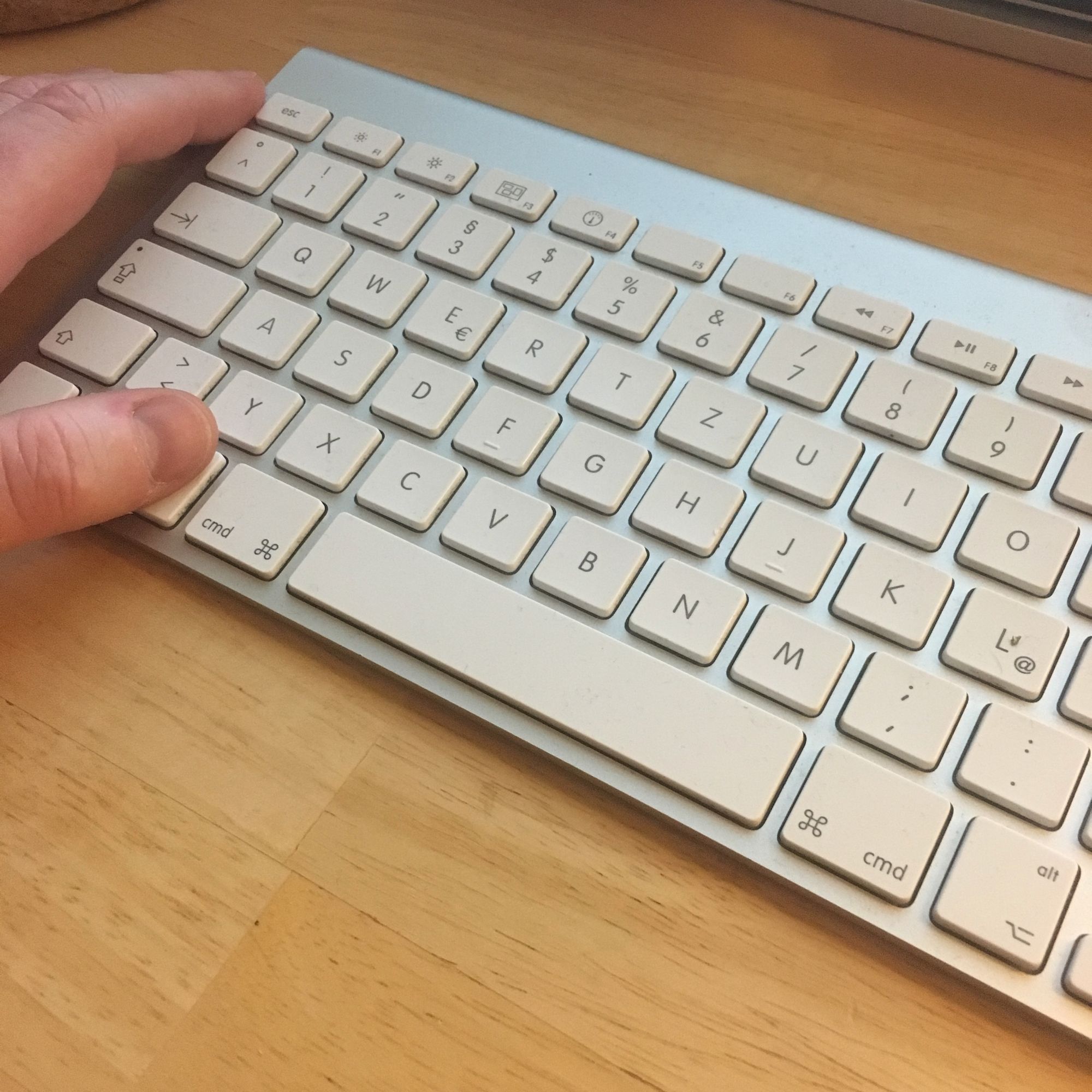 Vor dem Bildschirm liegt ein ziemlich profan anmutendes Apple Keyboard, und zwar das ALU mit USB-Kabel und NUM-Block (A1243). Dieses hier (Kein Affiliate-Link). Ich liebe es darauf zu schreiben. Obschon die Tastatur echt alt ist. Zuvor benutzte ich ein Apple Bluetooth Keyboard, ohne NUM, aber das hat mir nicht so gut gefallen. Außerdem ist es ungemein praktisch zwei USB-Anschlüsse zur Hand zu haben.