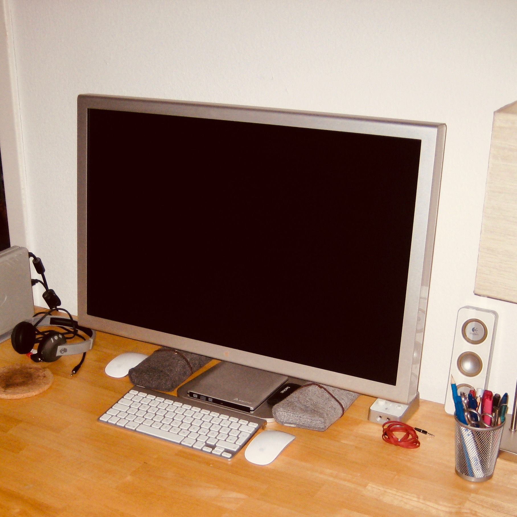 Zunächst steht auf dem Schreibtisch mein Apple Cinema Display. Das Teil hat 30" und war damals das legendäre Flaggschiff von Apple, es war kaum bezahlbar und kostete zur Markteinführung $3299. Unglaublich, oder? Ich habe diesen Preis natürlich nicht bezahlt, sondern suchte nach einem Bildschirm den ich nach dem Verkauf meines iMacs 27" nutzen könnte. Und dann gab es ein Angebot, was ich nicht ausschlagen konnte. Seitdem bin ich sehr zufrieden.