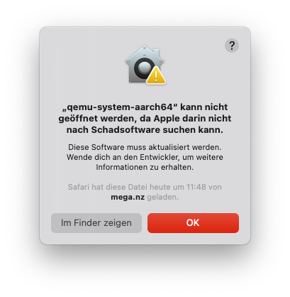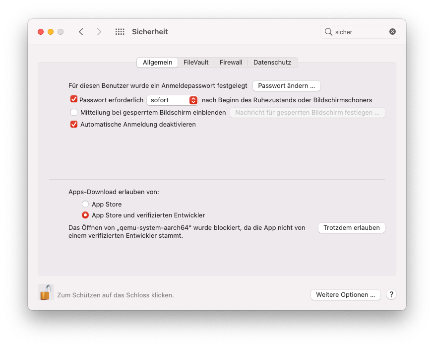 - Klickt okay und geht folgendermaße vor: Öffnet die Systemeinstellungen und wechselt zum Reiter "Sicherheit". Dort hebt ihr mit dem Schlosssysmbol den Schutz auf und erlaubt das Öffnen von "qemu-system-aarch64" mit "Trotzdem erlauben".