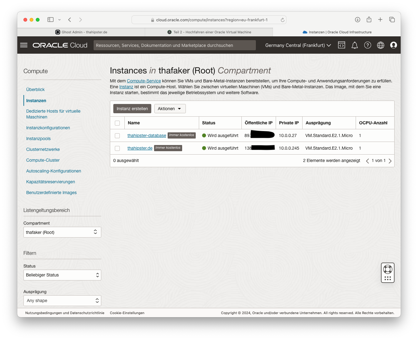 Wechseln Sie zu den Compute-Instanzen zurück. Dort sollte Ihre neue Instanz mit der Flagge „Immer kostenlos“ angezeigt werden.