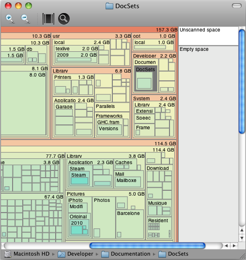 An dieser Stelle möchten wir mal einen kleinen Software-Tipp abgeben. Und zwar haben wir das Problem, dass unsere kleine 128Gb SSD häufig mal an ihre Grenzen kommt und sich dadurch das ganze OSX seltsam verhält. Da keine größeren Apps installiert sind, wollten wir gerne wissen, wo die dicken Dateien liegen. Doch wie bekommt man das raus?