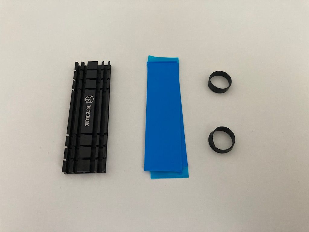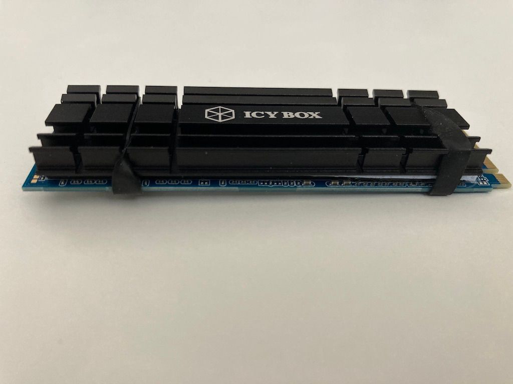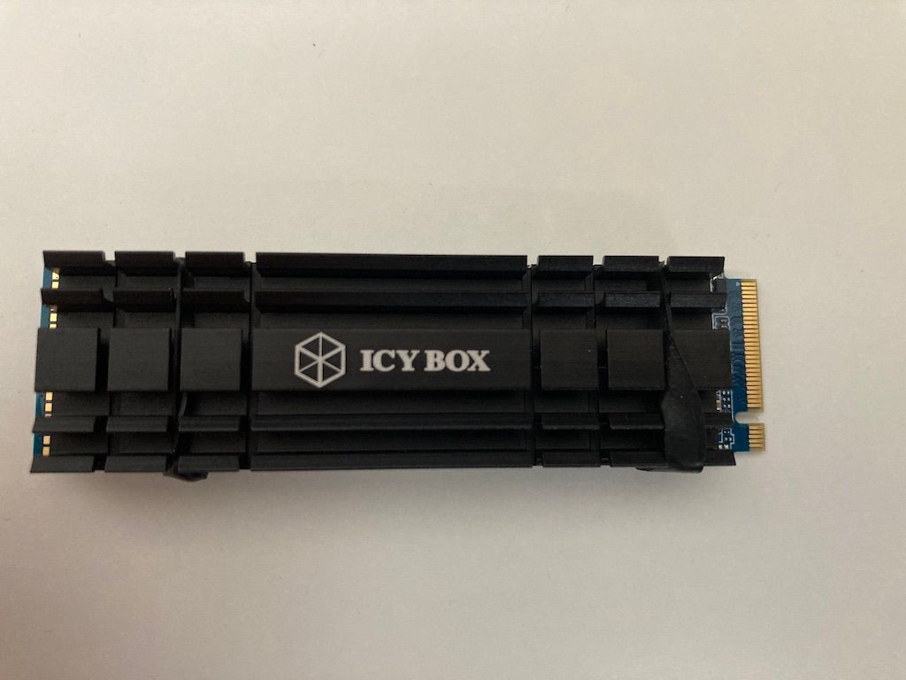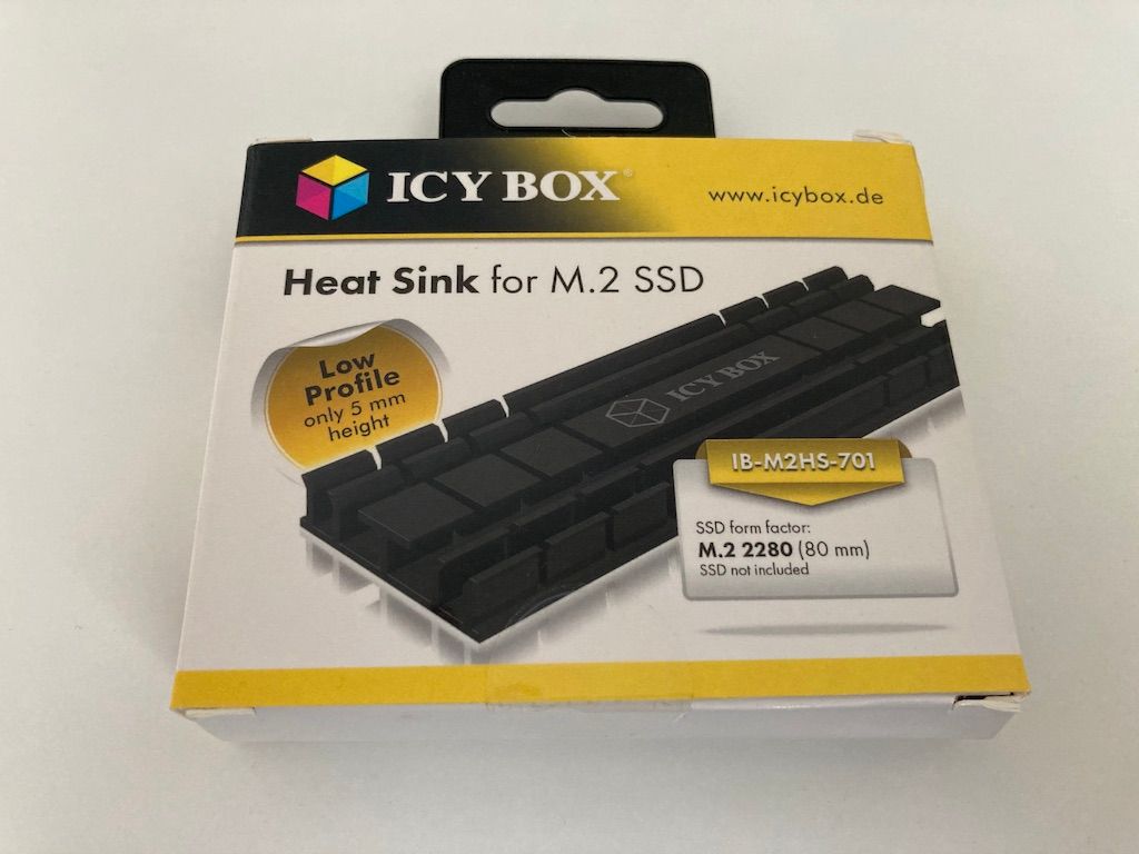 - ICY BOX Flacher M.2 Kühler mit 5 mm Bauhöhe für M.2 SSD (2280), Aluminium, 2x Silikon Wärmeleitpad, selbstklebend, passiv, Schwarz (Link)