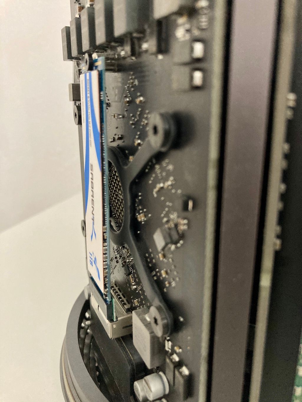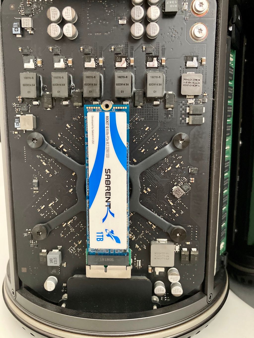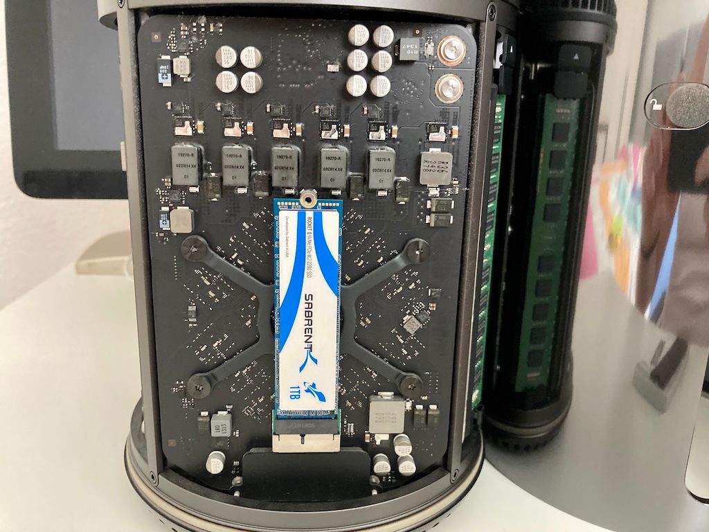So zusammen gebaut wird die Sabrent SSD also in den MacPro eingesetzt. Zuvor habe ich die Apple SSD ausgebaut. Das ganze sieht dann folgendermaßen aus: